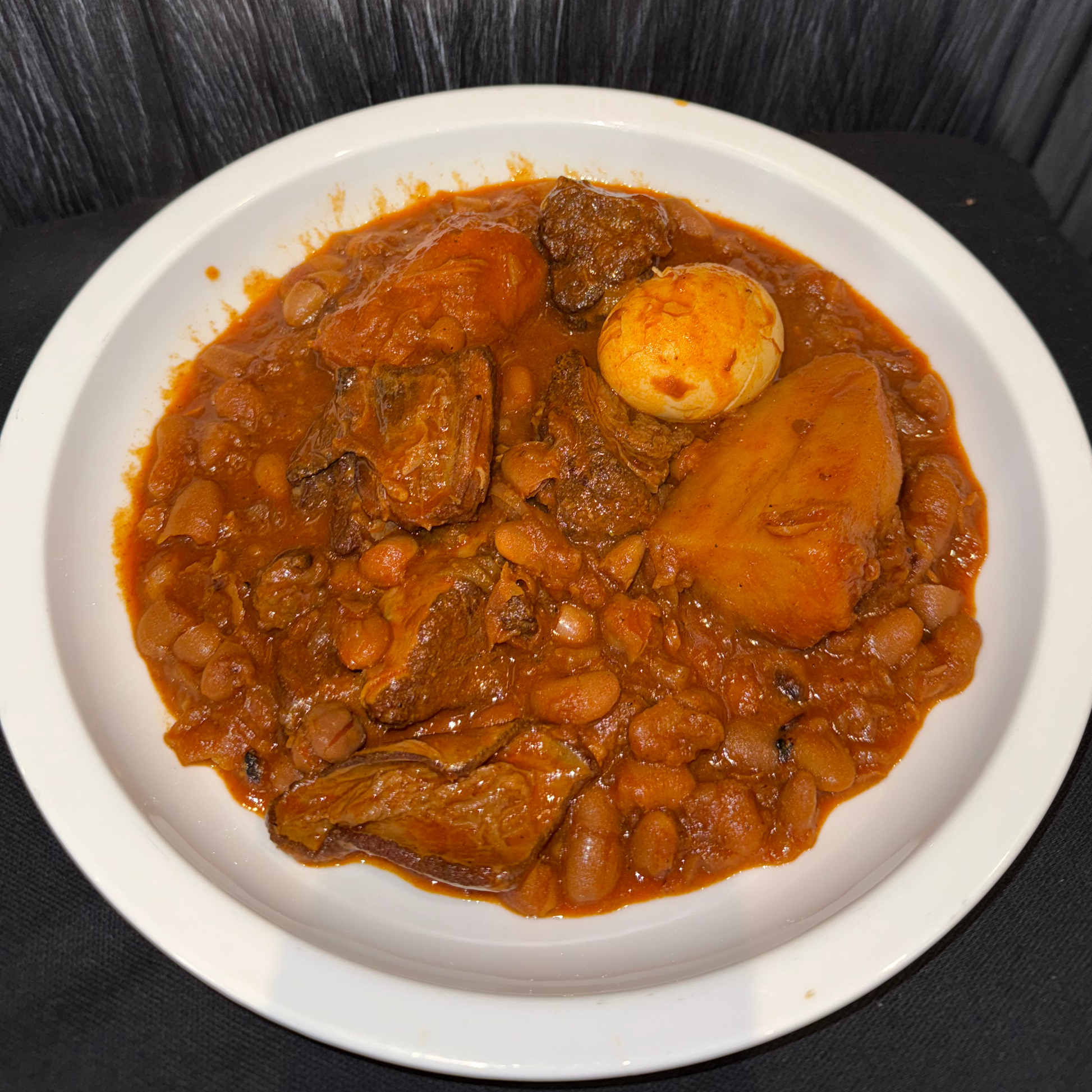 Traditional Shabbat Chamin – Slow-cooked beef short ribs with beans, chickpeas, barley, potatoes, and sweet potatoes